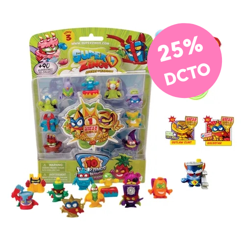 Blister Pack 10 unidades: Un pack imperdible para coleccionistas! Contiene 10 figuras SuperZings: 9 figuras más 1 figura super rare garantizada! Aumenta tu colección con héroes, villanos y una figura exclusiva que no encontraras en cualquier sobre!